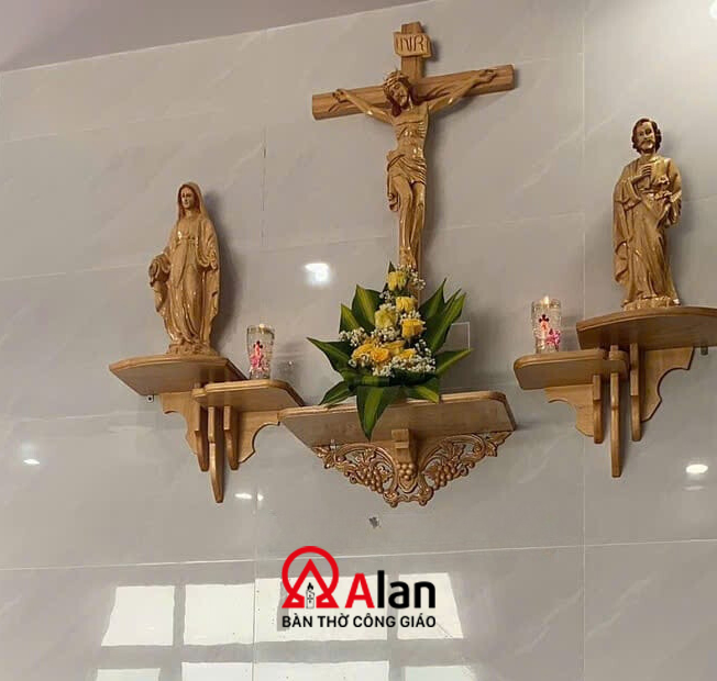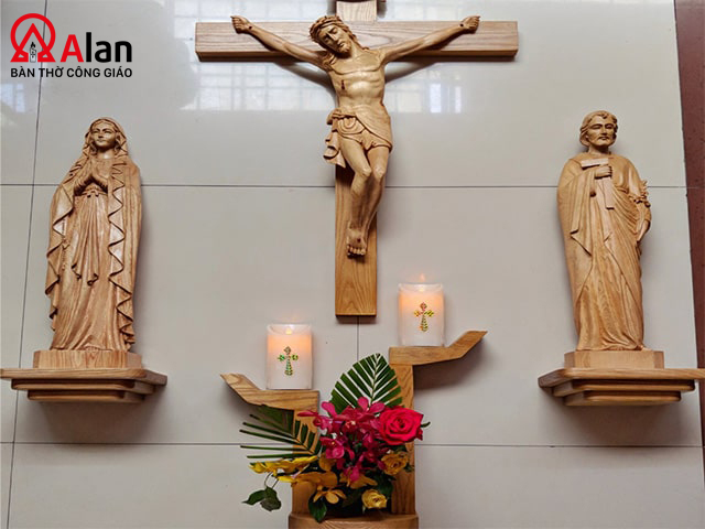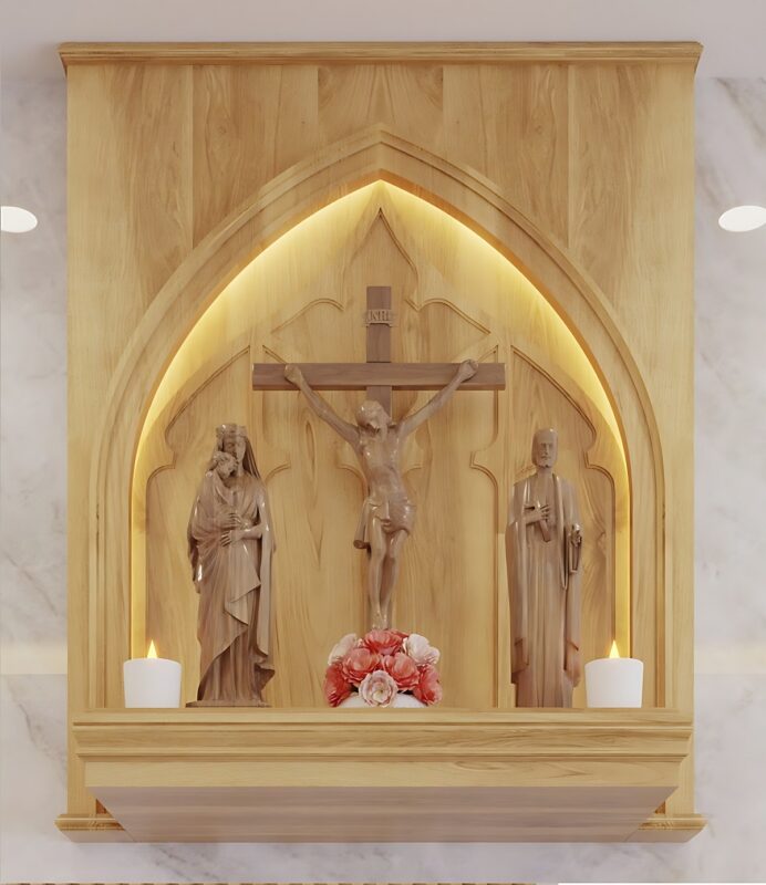 Một bàn thờ đẹp không phải ở sự xa hoa, mà ở tinh thần tôn kính và lòng mến Chúa được gửi gắm qua từng đường nét. Như trong bức ảnh trên, bàn thờ được làm bằng gỗ tự nhiên chạm khắc tinh tế, màu nâu trầm mang lại cảm giác ấm áp, gần gũi và trang nghiêm. Ở vị trí trung tâm là Thánh giá Chúa Giêsu chịu nạn, biểu tượng của tình yêu vô điều kiện và ơn cứu độ cho nhân loại. Hai bên là Đức Mẹ Maria và Thánh Giuse – hai gương mẫu của lòng trung tín, thinh lặng và đức hiền hòa trong gia đình.