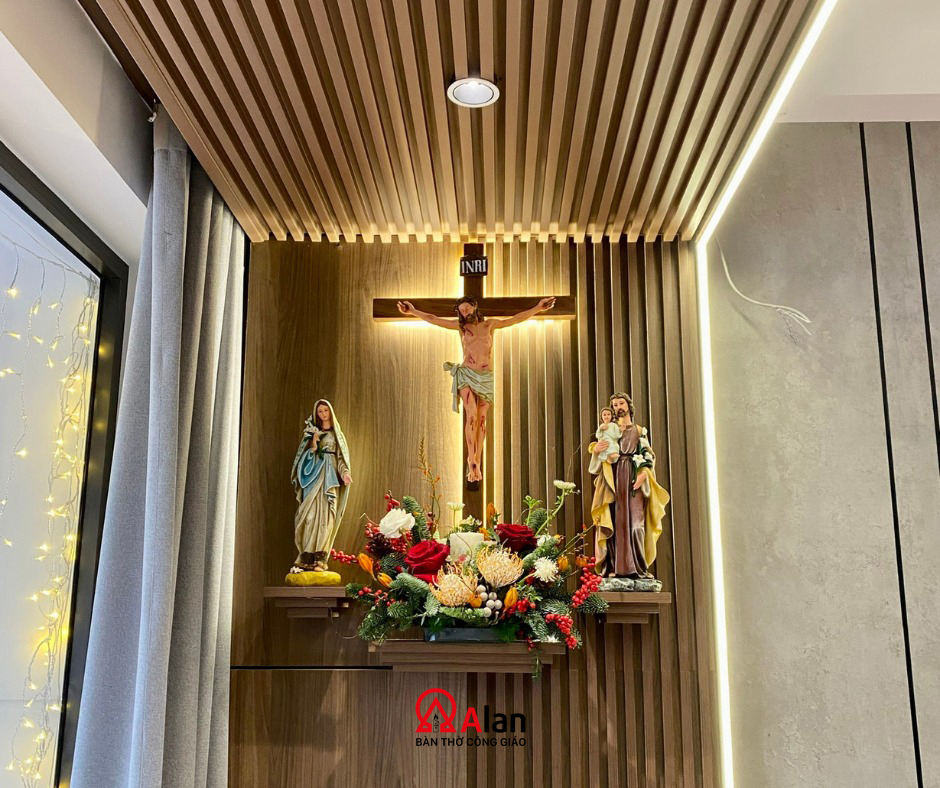 Bàn thờ thường được làm từ gỗ tự nhiên cao cấp như gỗ sồi, gỗ gõ đỏ, gỗ xoan đào, vừa bền vừa giữ được màu sắc sang trọng. Phía sau là phông ốp lam gỗ hoặc MDF chống ẩm, tạo chiều sâu cho không gian. Phía trên là kệ treo Thánh giá, hai bên có thể trang trí thêm đèn chiếu sáng nhẹ hoặc lọ hoa tươi để bàn thờ luôn tươi mới. Những yếu tố ấy, khi được phối hợp hài hòa, không chỉ tôn lên vẻ đẹp của đức tin mà còn giúp căn nhà thêm phần ấm cúng và tinh tế.