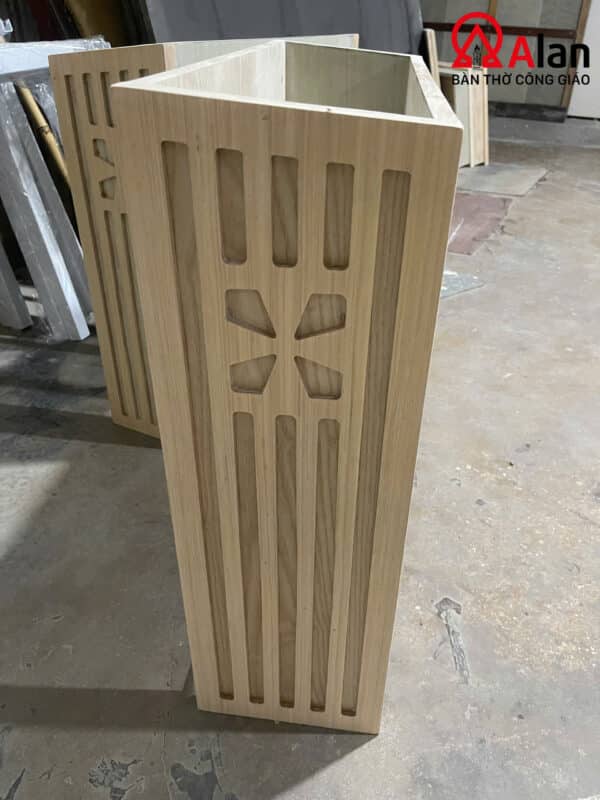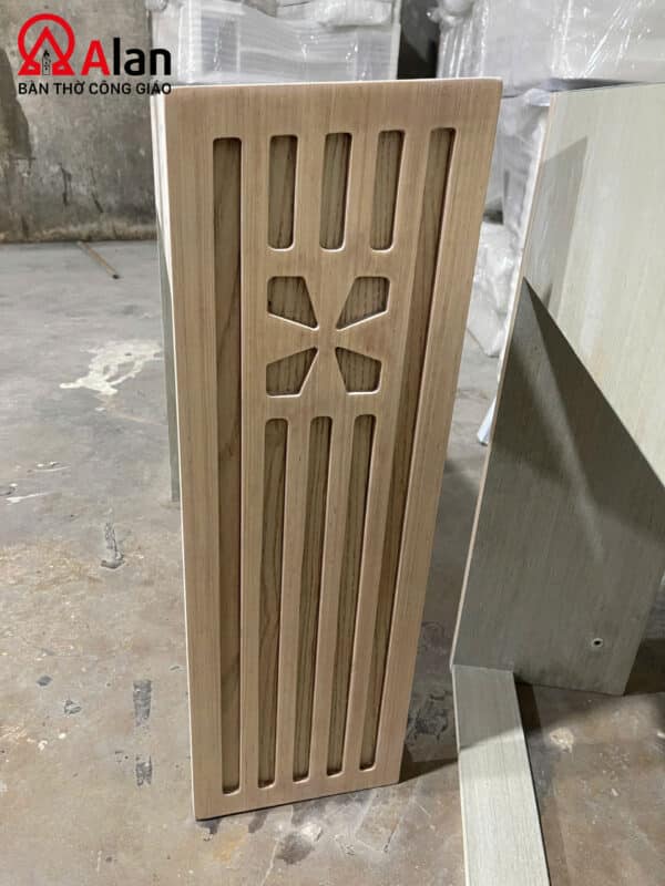 Phần hông ghế được gia công soi rãnh dọc kết hợp họa tiết Thánh Giá cách điệu. Đây không chỉ là điểm nhấn thẩm mỹ mà còn thể hiện rõ tinh thần Công giáo, giúp sản phẩm mang giá trị biểu tượng rõ ràng nhưng vẫn giữ được nét tinh giản, sang trọng.
